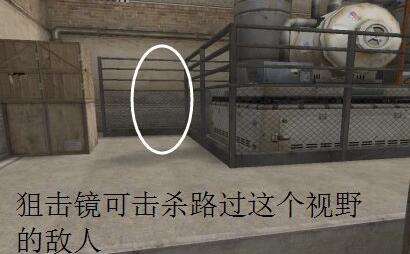 这个是狙击视野,从这个位置,我们可以轻而易举地观察到B区铁丝网后排的动向,在保卫者打A到潜伏家时,如果这个时候潜伏在B区下包,那么拿狙的玩家可能试着在这个点位卡一卡,因为潜伏方下包之后很喜欢在铁丝网附近躲藏。