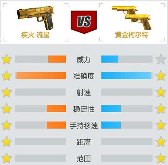 综合对比,疾火流星比黄金柯尔特外观更炫,载弹量更多,获得途径及期限更深入人心,伤害更高,弹道方面基本相同。虽然两把武器最终都是属于双枪柯尔特系列。但是优劣已经很明显了,所以建议使用疾火流星,虽然这两把枪都很少有人使用。也仅仅是因为他们微弱的伤害,但是他们的射速是不容忽略的,他们的射速完全可以填补伤害的不足。