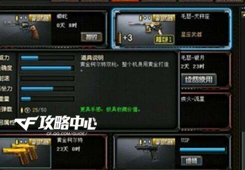 相比较而言首先名称和系统介绍疾火流星已然胜了一筹,再者疾火流星更大的载弹量和永久的使用期限(如果你活动时准点在线的话)相比黄金柯尔特又胜一筹。副武器中单弹夹二十多发子弹十分稀有,所以两把枪相对其他副武器来讲弹夹容量十分占优。