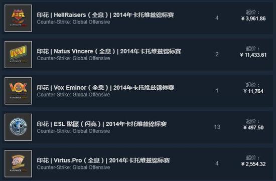 说到价格,2014年卡托维兹锦标赛印花就是一个数量影响价格的经典例子,这是V社推出的第一套赛事印花,当时的玩家为了图个新鲜,拿到手就都粘贴到了枪上。但是贴上的印花就不能再单独交易,所以大量的印花都沉没在了玩家的库存里,流通数量非常少,价格自然一涨再涨。