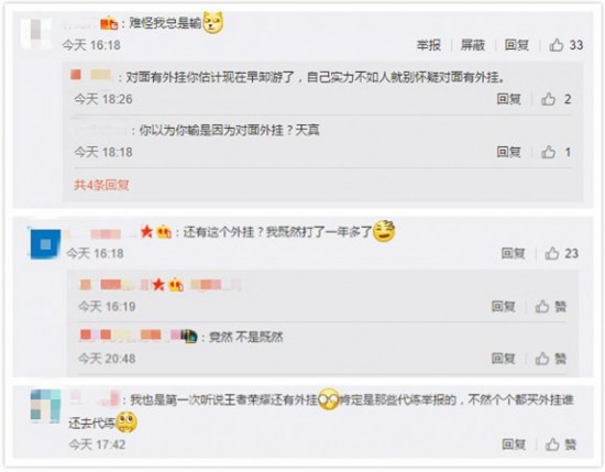 不同于其他游戏,玩家们对于《王者荣耀》存在外挂这件事情表现的极为惊讶。微博留言中,大部分网友留言都是“难怪我总是输”、“还有这个挂?”、“第一次听说王者荣耀还有外挂”等。
