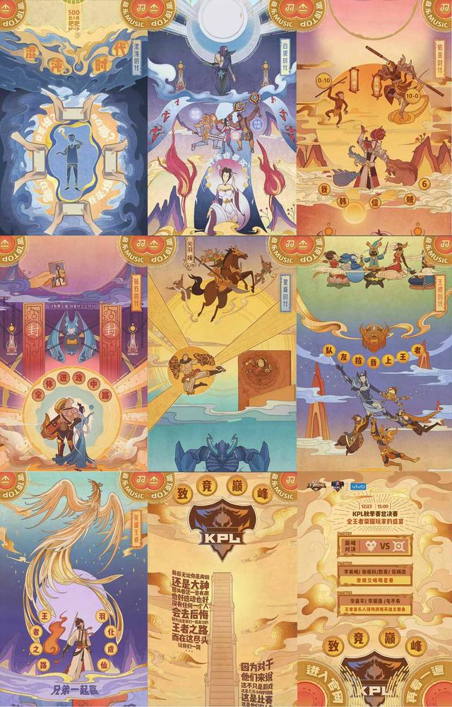 整个H5采用了古代神话浮世绘的画风,还原了从混沌时代“入坑”,再慢慢向上“爬升”至“白银”、“黄金”…到“星耀”、“王者”再到“到达KPL“致竞巅峰“。不同的段位配合不同的英雄和语音与玩家梗文字,如“我韩信贼6“”我方猴子、敌方猴子“等,勾起了王者玩家们的满满回忆。