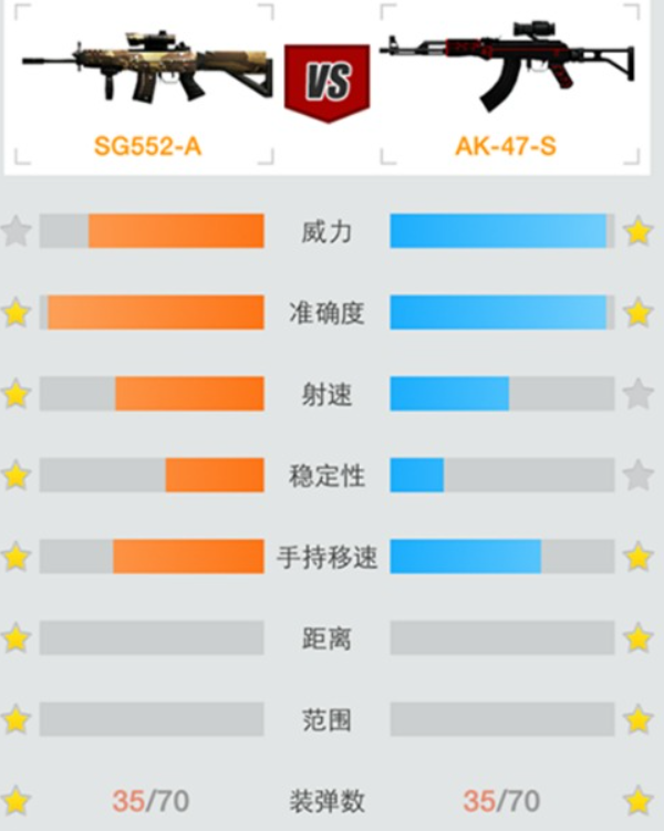 既然SG552-A的瞄准镜是它的特色,那么我们就将它与另一把带有瞄准镜的步枪AK47-S进行比较。从对比中可以看出,威力方面不出意外是AK高,毕竟比AK系列威力大的寥寥无几。在准确度和载弹量方面,二者几乎是持平状态。而在射速和稳定性两个方面,SG522-A是完胜的。从整体来看,这二者可以说是各有千秋。