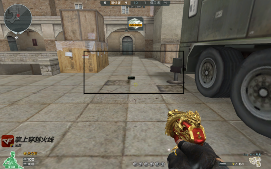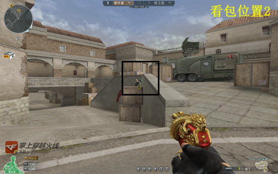 由于看守的这个位置需要经过斜坡或者楼梯上包点,算是离包点有些距离,所以C4最好下在图中黑框的范围内,这样就可以在4S的极限拆包时间内将敌人补掉。