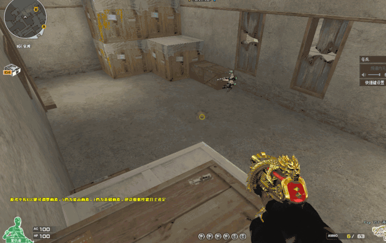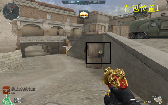 如果有小伙伴担心自己在第一个看守位置可能来不及反应的话,我们也可以选择上图的这个位置。这里可以在敌人拆包时直接跳起来击杀敌人。但是这个位置也有一个弊端,那就是自己需要看守的方向变多了,桥下、A大、小道这些位置都需要兼顾,所以这个位置可以在已知敌人在B包点方位时使用。