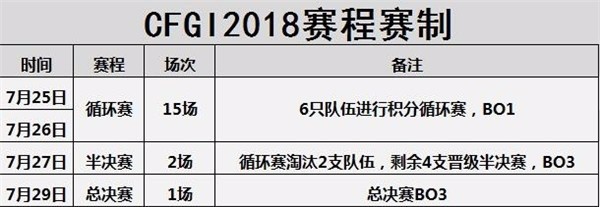 今年CFGI的比赛时间为7月25日——7月29日,比赛场地分别为中国的太仓和上海,太仓先打循环赛以及半决赛,总决赛两支队伍则将在中国美丽的沿海城市——上海开展最终的总冠军争夺。7月25日—7月26日是BO1的循环赛,循环赛积分淘汰后两名,然后在7月27日进行BO3半决赛,7月29日在上海进行BO3总决赛。今年总冠军队伍的奖金高达$50,000!赛事总奖金达到了惊人的$100,000!丰富的奖励一定会将选手的激情推向高潮,各豪强摩拳擦掌,一定会给广大玩家和观众带来精彩无比的比赛。