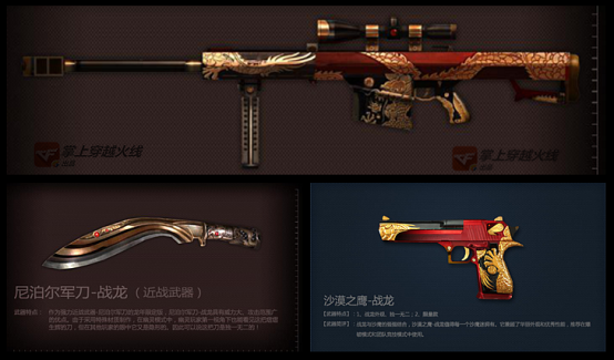 系列套装虽说名字与外观都非常相近,但是武器的种类其实并不完善。而诸如“战龙套装”之类的套装型武器出现后,套装武器实现了进一步的进化与完善。此时武器不仅有了整齐划一的名字,武器的种类也更加的丰富。