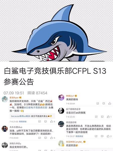 2018年7月9日晚,本应是个平静的夜晚。可就在平静的夜晚七点左右,一条微博让广大CFer们激动万分!白鲨电子竞技俱乐部官博发文:白鲨电子竞技俱乐部CFPLS13参赛公告!这突如其来的公告让广大白鲨粉丝无不为之高兴,纷纷在官博下留言。