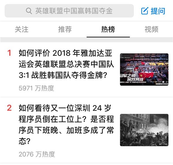 在中国团队战胜韩国队的那一刻,从比赛场馆到社交平台,集体沸腾,共青团中央、新华社、人民日报、CCTV5、中国日报等数十个央媒党媒发布新闻庆贺中国团队夺得金牌,并迅速延伸至全网络,而在接下来的1个小时里,英雄联盟夺冠的消息开始称霸各大社交平台。