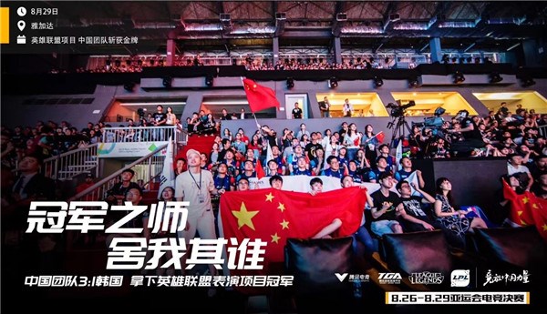 2018年8月29日,雅加达亚运会英雄联盟表演赛落下帷幕,经过4局激战,最终英雄联盟中国团队以3比1的比分战胜韩国队,创造历史,斩获首届亚运会电竞项目金牌。