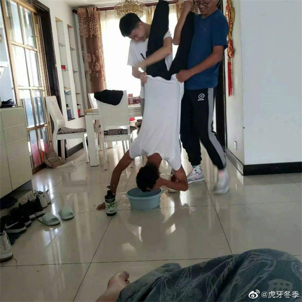 在接受了一百天不洗头挑战后,骚皮皮真的言出必行,说到做到,能不洗的头绝对不洗,即使刘海都油成了条形码也无所畏惧。最终兄弟们实在看不下去,决定强迫骚皮皮洗头,还有粉丝主动提出邮寄洗发水给骚皮皮,来助攻一波。若是骚皮皮坚持不洗,就会像下面这张照片里的小伙子一样被“暴力执法”,整个人被两名壮汉抓脚倒立,完成一次轰轰烈烈的“洗头盛宴”,下面就让我们求求骚皮皮的心理阴影面积有多大吧!