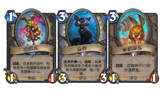 猫猫狗狗和兔兔们也是炉石中的老可爱鬼了,进化萨常用的沙漠野兔、炉石酒馆中的机械蹦蹦兔(盗贼职业卡牌)、荣誉室中的法师牌“黑猫”,都是玩家们十分喜爱的动物随从。人嘛,怎么能拒绝一只小可爱在你身旁喵喵叫呢。