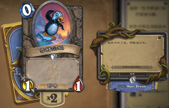 看到萌物来袭之后,笔者翻遍了炉石牌库,发现有这么几只小可爱确实与别的随从画风完全不一样,以至于翻到它所在的那一页时就能深切的感受到它在盯着你卖萌。其中一些小生物的幼崽是最显眼的。雪鳍企鹅、鱼人宝宝、恐角龙宝宝....把它们放上战场简直是暴殄天物,作为一名有良心的牌手,怎么忍心攻击这么可爱的小家伙们嘛。