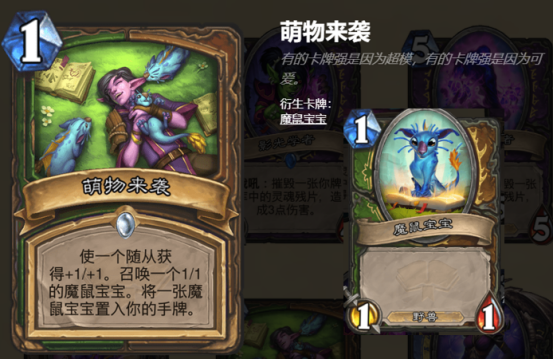 在一众以黑魔法为主的新版本法术中,前几天突然多出来一张“萌物来袭”,完全不同的卡面风格与奇怪又可爱的卡牌描述让不少玩家眼前一亮。玩腻了邪灵法术、看腻了刀光剑影的玩家终于在炉石中可以拥有一张又萌又可爱的法术牌了,一瞬间对新版本充满了期待。