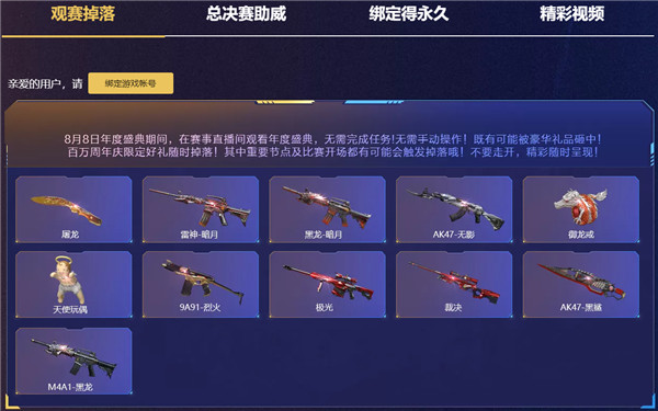 在斗鱼直播平台上观看8月8日CFPL总决赛一共有三大活动。其一便是“观赛掉落”,顾名思义便是在8月8日斗鱼平台赛事直播间观看年度盛典,无需完成任务!无需手动操作!便有可能被豪华礼品砸中!我们可以看到奖池中有英雄级武器以及稀有道具!