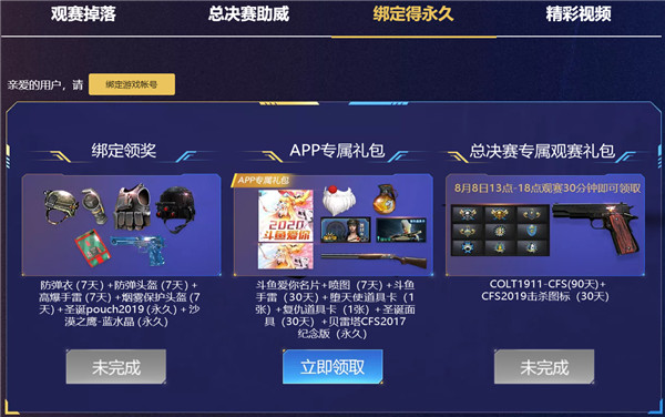 第三个活动是“绑定得永久”,分为“绑定领奖”、“APP专属礼包”以及“总决赛专属观赛礼包”三个子活动,这三个子活动都有不少的道具相送,尤其是“总决赛专属观赛礼包”在8月8日13点-18点观赛30分钟即可领取CFS2019击杀图标(30天)以及CFer们都非常期待的柯尔特1911-CFS(90天)。