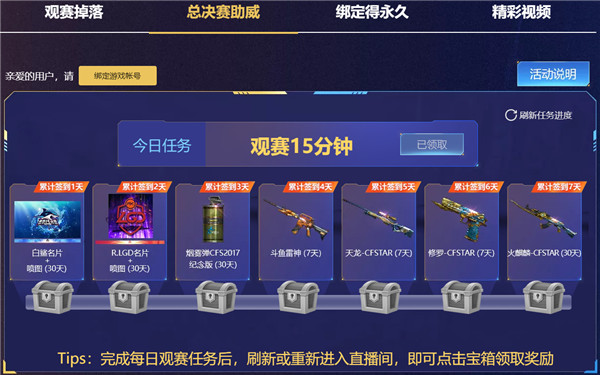 第二个活动为“总决赛助威”,是一个累积签到的活动,每日观赛15分钟即可完成观赛任务,刷新或者重新进入直播间即可点击宝箱领取奖励,每签到一次即可解锁一个道具,一共可以解锁七个道具,道具有名片、烟雾弹以及枪械皮肤。