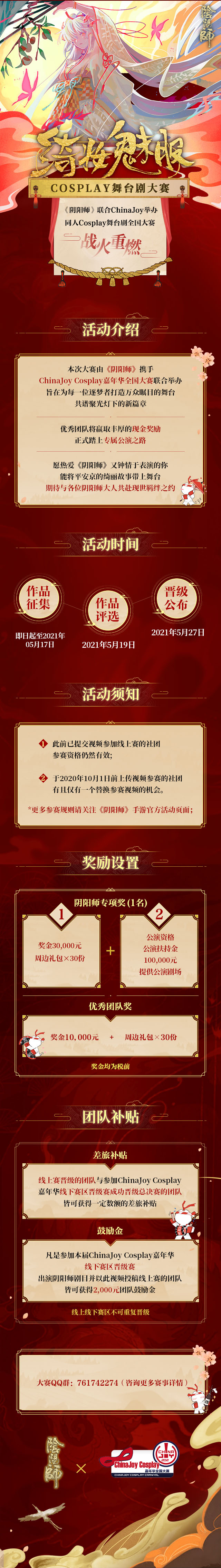 参赛者可自由组队以《阴阳师》手游为主题创作剧目参赛。既可以参加《阴阳师》线上赛区投稿,也可以参加ChinaJoy Cosplay嘉年华全国大赛线下赛区获得晋级机会。