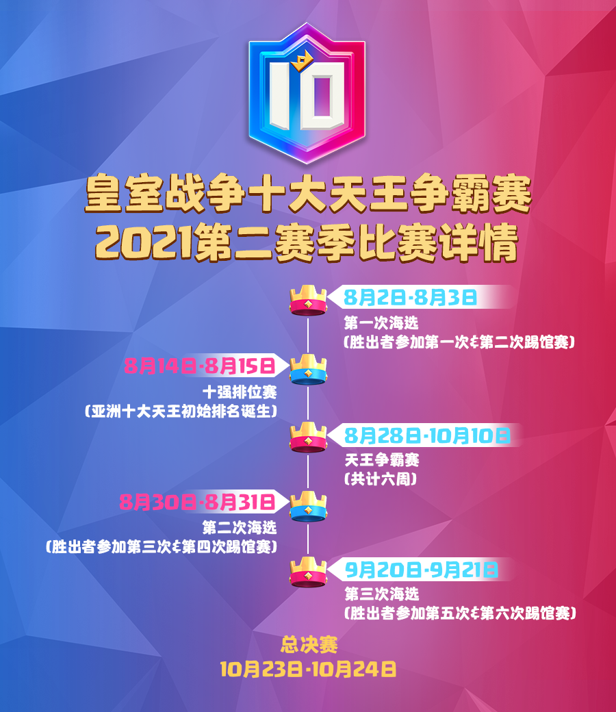 精彩纷呈的皇室电竞下半赛季,就从本周末的CRSC第二赛季拉开序幕!8月14日—15日(本周六至周日)每天17点,2021皇室战争十大天王争霸赛CRSC第二赛季震撼回归、全球首播,全亚洲最顶尖的十位高手蓄势待发、竞逐巅峰,未来的三个月里,几乎每个周末都有亚洲天王们与你相伴,锁定CRSC直播,让我们一起见证亚洲最强天王的加冕!