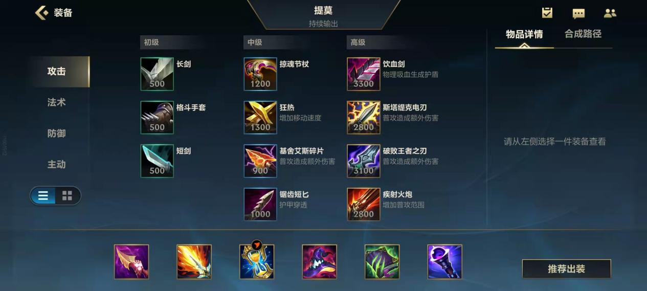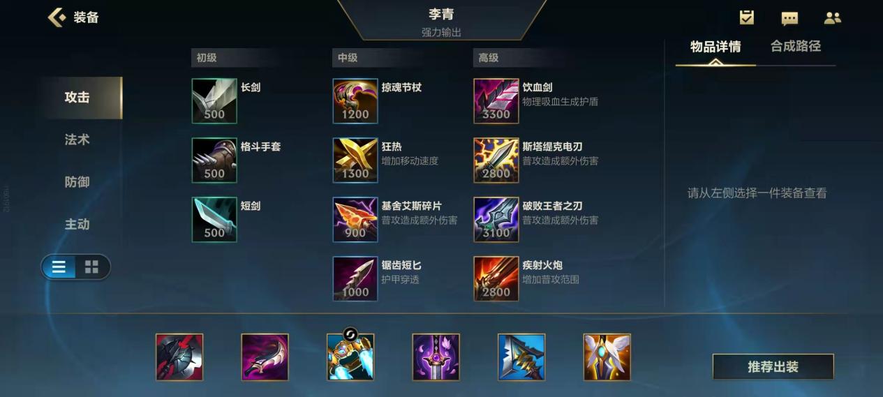 爆发流的盲僧建议走穿甲的出装思路,黑切、幕刃、幽梦、塞瑞尔达的怨恨都是穿甲装,都是比较适合盲僧的。想要保证容错率的玩家第一件装备可以优先出黑切,对操作比较有信息的可以选择幽梦,能加强游走和秒杀脆皮的能力。鞋子方面可以选择明朗·推推棒,CD越短盲僧的可操作空间就越大,推推棒的短距离位移可以帮助盲僧更好地进场释放出回旋踢。最后一件装备选择复活甲,在打团时多一分容错。
