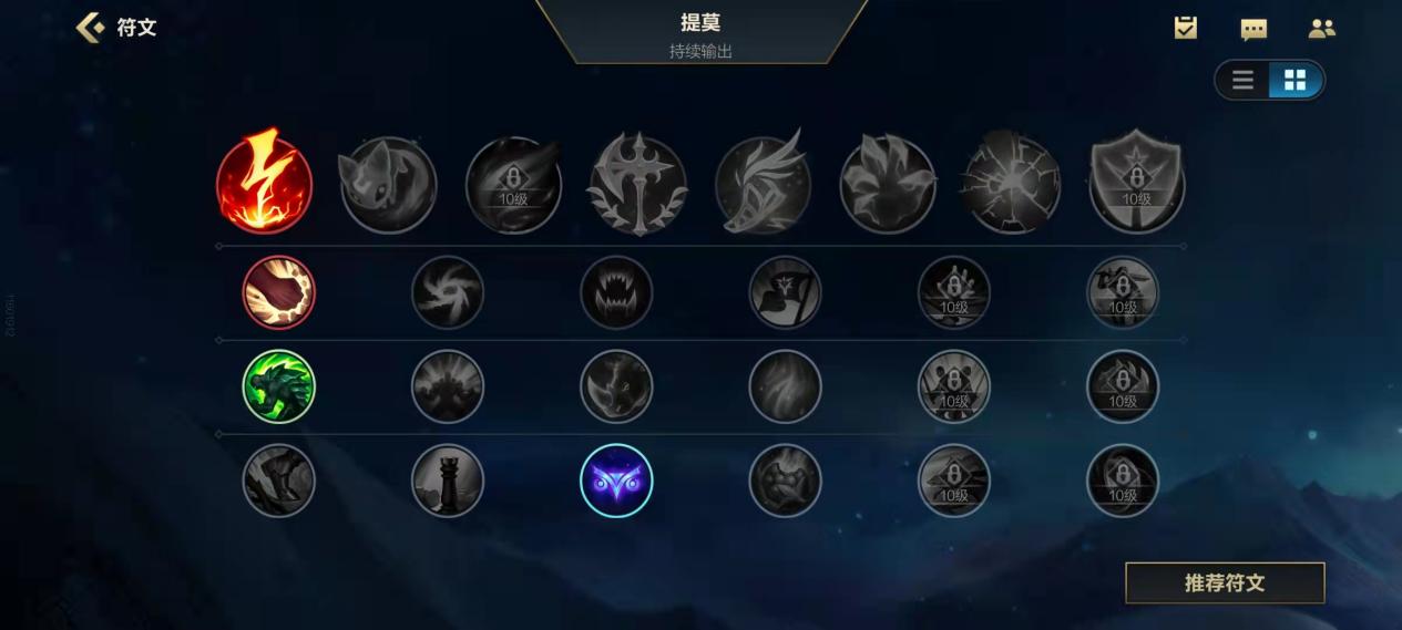 提莫的持续输出有被动的中毒效果可以保证,所以在符文携带上可以选择电刑来强化其爆发伤害,让提莫变得更加全能。副系符文建议带残暴、适应性外壳、猎人:天才,残暴提供法强和法穿效果增强秒人能力,适应性外壳可以降低被刺客秒杀的风险,天才提供技能急速让提莫的Q、E技能在短时间内释放,POKE能力得到强化。