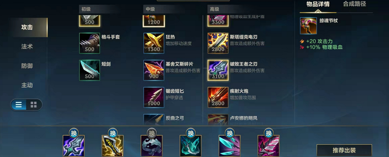 破败是剑圣的核心装备,提供攻速、吸血、攻击力加成的同时,还能对敌人造成百分比伤害,在面对高坦度的前排英雄时也能轻松将其防线瓦解,汲取的被动效果可以保证剑圣的粘人能力。无尽、饮血增强伤害的同时保证持久战的续航能力,幻影之舞可以在关键时刻给剑圣一个护盾,可以给剑圣创造更多绝地反击的机会。纳沃利迅刃可以在剑圣打出暴击效果后降低小技能15%的冷却时间,可以加快剑圣的收割速度。