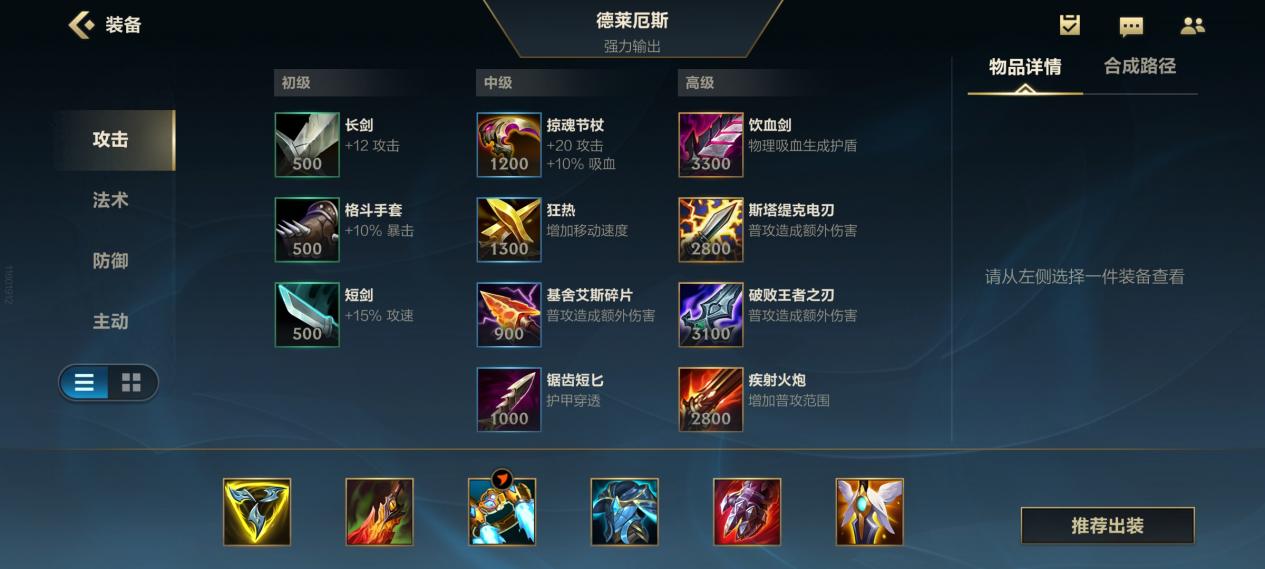 诺手的核心输出装备为三项,选择三项可以全方面地提高诺手属性,咒刃效果可以强化普攻和W的伤害,5%的移速加成可以让短腿的诺手机动性变得更高。血手、死亡之舞能提高攻击力加成,且在面对AD英雄时容错率有所提高。自然之力能强化魔抗,可以更好地抵御法系伤害,该装备也能提供移速加成,可以配合三项进一步提高诺手的追击、逃跑能力。复活甲用来提高后期团战的容错率,一般最后一件才出。鞋子方面选择布甲鞋或是魔抗鞋(视对方阵容而定),附魔为推推棒,可以短距离进行一段位移,给诺手更多的操作空间。