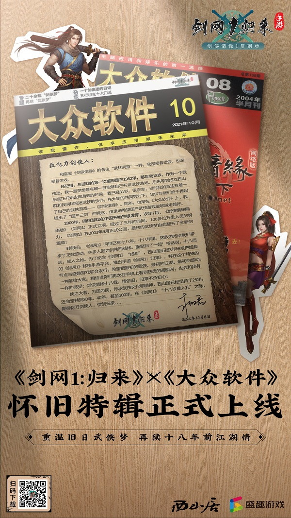 《剑网1:归来》×《大众软件》怀旧特刊将金山创始人求伯君“致亿万剑侠人的一封信”作为封面,以游戏代言人赵文卓为内容首页,展开回忆剑网十八载带给所有剑侠人的故事和感动!特刊当中记录了一位十八年剑侠迷的真实日记,从抗拒、到接触,并喜爱上“剑侠情缘”!他在日记中分享了十八年前和剑网1的帮会兄弟一起发生过的趣事,以及那些遇到过的形形色色的人,这些都成为了他无法忘记的珍贵记忆。