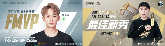 同时TC·Suk选手斩获了S4赛季总决赛FMVP,DKG·770选手获得了最佳新秀荣誉,腾讯游戏光子工作室群策划总监、《和平精英》策划负责人黄鑫龙先生与腾讯游戏光子工作室群运营总监、《和平精英》运营负责人吴波女士为两位表现突出的选手颁发荣誉奖励。