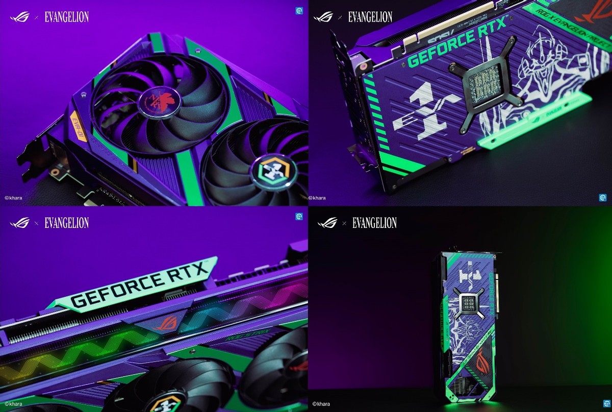 显卡作为整机中的性能担当,和主板一样选择了EVA的初号机风格进行设计,基于ROG STRIX的设计理念,将初号机的紫色和绿色融入原设计之中,金属风质感的外观展现出绝佳的制造工艺,同时搭配了交错的纹理十分富有质感。显卡正面风扇中央金属贴增加了NERV基地和初号机的Logo,直接亮明的EVA初号机设计元素。侧边的波纹图形灯带参考了原作中EVA机体和驾驶员的同步率波形,象征了显卡会向着更高的频率冲击。