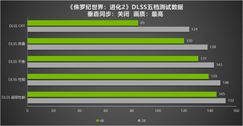 从测试结果中可以看出,在2K分辨率特效全开的情况下,RTX 3090 Ti已经能跑到124 FPS的成绩了。在开启DLSS技术后,帧数逐步上升最高可达到152 FPS。而在4K分辨率特效全开的情况下,开启DLSS技术与否差距比较明显。关闭DLSS技术的情况下只有85 FPS,而开启DLSS技术后帧数最高可达到145 FPS。