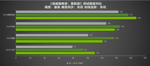 在光线追踪的情况下时,帧数有明显上涨。DLSS关闭时1080P可以跑到110FPS,2K分辨率能跑到94PFS,4K分辨率也能跑到79FPS的好成绩。DLSS开启时帧数能有更大的涨幅,1080P最高能跑到168FPS,2K分辨率最高能跑到157FPS,4K分辨率下最高能跑到143FPS。不过光线追踪关闭后画面质量明显下降,推荐玩家在游玩时开启光线追踪技术,以体验更好的画面质量。