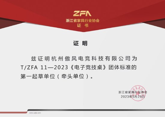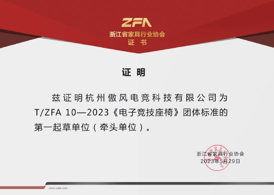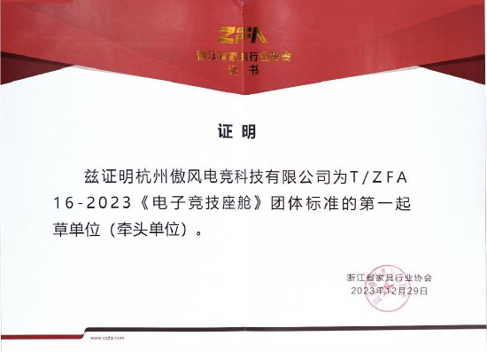 2023年12月29日,杭州傲风电竞科技有限公司领导制定的《电子竞技座舱》(T/ZFA 16-2023)团体标准正式由浙江省家具行业协会发布。这一标准的制定填补了业界的标准空白,同时与同年制定的《电子竞技座椅》和《电子竞技桌》团体标准一道,进一步规范了产品的技术要求。这三项团体标准将引领整个行业的发展,为规范电子竞技桌椅产品制造、提高电子竞技座椅产品质量,以及彰显“好家具·浙江造”提供了可操作性强的实践样本。