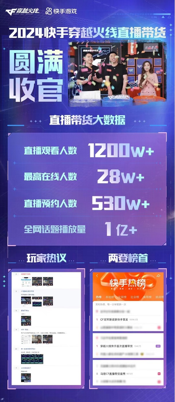 据官方数据显示,本次直播带货活动吸引了超过530万人预约观看,实际观看人数更是达到了1200万之多,最高在线人数28万,作为CF首次尝试直播带货的新模式,其表现相当亮眼。同时,这场直播带货全网话题曝光量超1亿次,相关话题两度登上快手热榜第一名,为CF的用户增长和活跃度提升做出了积极贡献。