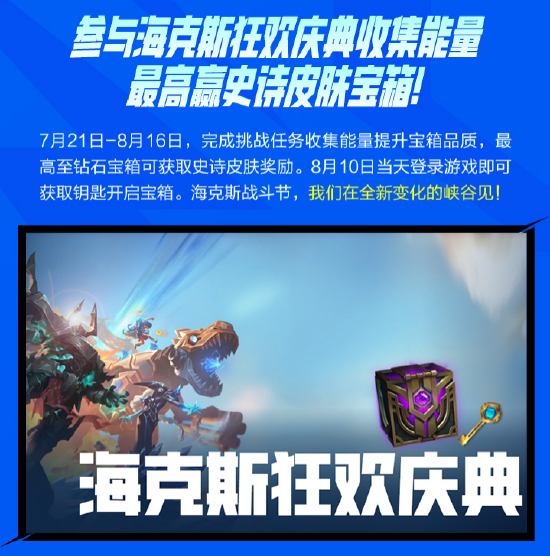 7月21日起至8月16日,完成每日指定挑战任务,还可收集能量。积累能量可升级宝箱,至高能升级至钻石宝箱。8月10日当天,登录游戏即可获取宝箱钥匙,召唤师将有机会开出史诗皮肤!