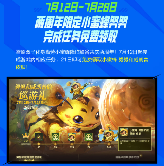 7月12日-7月28日,上线并进入“努努与威朗普的巡游礼”活动页面,即可参与完成任务以领取2周年限定皮肤“小蜜蜂 努努和威朗普”,以及专属姿态和皮肤边框。一起用滚滚的金色蜜糖,填满盛夏的峡谷吧!