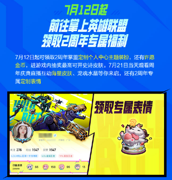 前往《掌上英雄联盟》填写祝福的同时,召唤师们也不要忘了在掌盟领取2周年专属福利。从7月12日起,进入活动页面即可领取掌盟2周年定制中心主题装扮和游戏内专属定制表情,观看直播并参与互动还有机会获得更多福利。