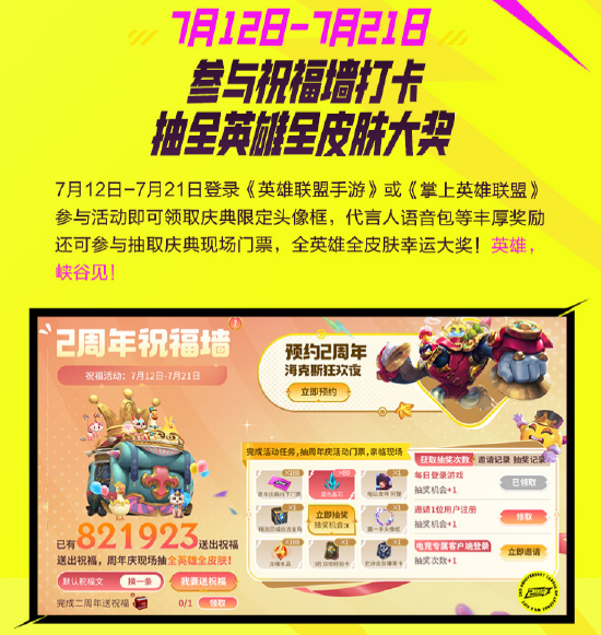 为了迎接《英雄联盟手游》的2周岁生日,游戏客户端内、掌盟还将分别开启祝福墙活动。