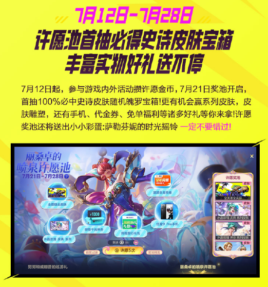 7月12日起至7月28日,“丽桑卓的喷泉许愿池”也将正式于端内开启。召唤师们参与活动攒下许愿金币,将有机会获得史诗皮肤随机魄罗宝箱,水晶玫瑰、星之守护者、泳池派对等多套系人气热门皮肤,以及“两岁快乐”出生印记等幸运大奖。