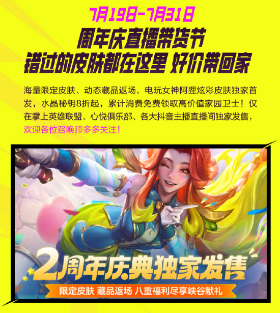 在2周年庆典期间,《英雄联盟手游》将于掌盟、心悦俱乐部,以及各大抖音主播直播间开启促销活动,除海量限定皮肤、动态藏品返场外,还有折扣等限时优惠。