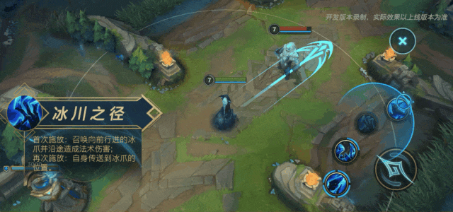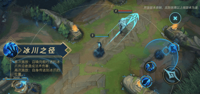 三技能冰川之径,丽桑卓将召唤前进的冰爪,对触碰到的敌人造成伤害。与此同时,冰爪前进的短时间内再次释放冰川之径,能让丽桑卓立即传送到冰爪位置,传送后冰爪立刻消失。