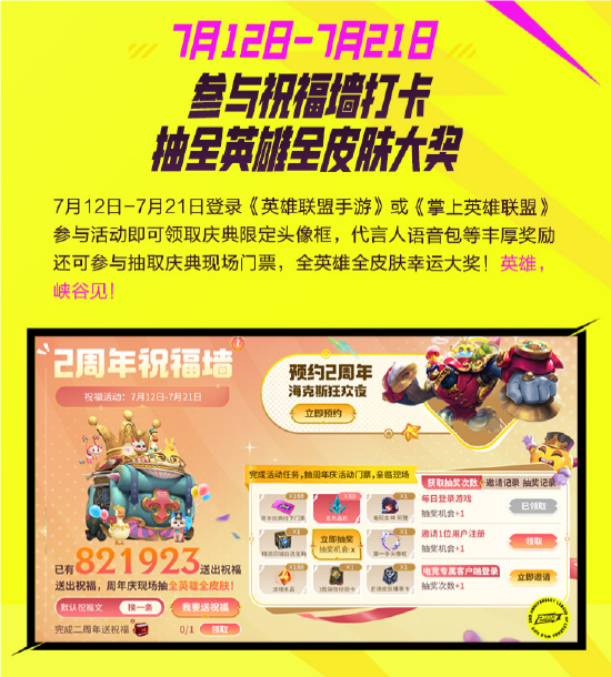 此外,召唤师在7月12-21日期间打卡祝福墙参与抽奖,还将有机会赢得全英雄全皮肤大礼!