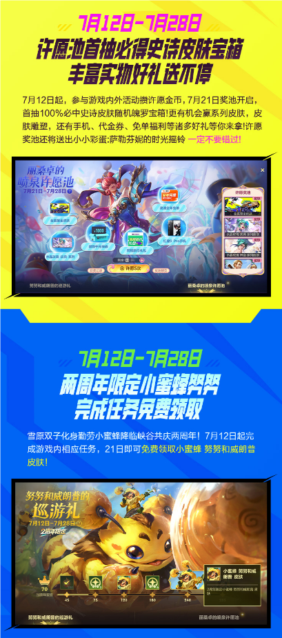 7月21日当天,“丽桑卓的许愿池”首抽必得史诗皮肤宝箱,完成任务免费领取2周年限定皮肤小蜜蜂努努和威朗普,参与海克斯狂欢庆典,可获取随机皮肤宝箱。