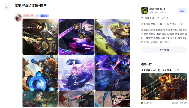 玩家们讨论颇深的“龙龟宇宙”梗,其实早在贴吧时代就已埋下种子。当时,一群老哥不忍心看本命英雄“龟龟”人气低迷,于是自发开启了狂欢式二创,为各路英雄“披”上龟壳,衍生出大量脑洞大开的龟化神图。随着热度攀升,“P假龙龟”这个名号不胫而走,甚至催生了“披甲龙龟吧”这样的玩家聚集地。