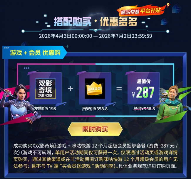 咪咕快游为《双影奇境》国行版玩家准备了多重超值入手方案。购买游戏后,仅需加2元,即可获赠游戏手柄一副,双人游玩设备一步到位。咪咕快游年卡会员购游戏可享75折优惠,订购咪咕快游年卡的用户还可直接免费领取该游戏,多种方案适配不同玩家的需求。此外,所有用户均可免费试玩序章内容,先体验再决定,完全没有后顾之忧。