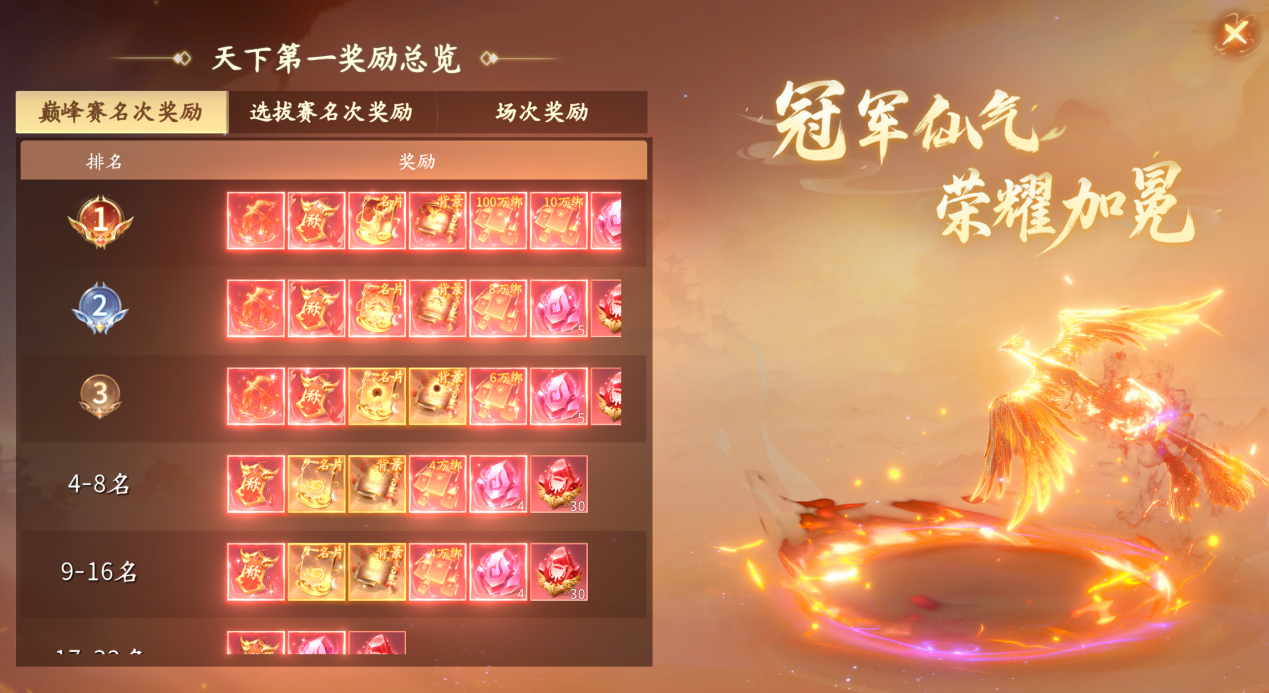 本届赛事最大的亮点在于完善的荣誉体系。游戏内,冠军玩家可获得高价值道具池奖励,包括粉色洗练石、混沌宝晶等稀有养成材料,以及冠军定制外观——仙气特效、冠军名片、冠军背景、冠军称号 + 前缀,彰显独一无二的荣耀身份。