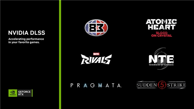 本周《异环》(NTE: Neverness to Everness) 将在中国开启公测,并于下周开放全球公测,游戏支持 DLSS 超分辨率、DLSS 光线重建、DLSS 多帧生成以及路径追踪效果。‘83 将开启抢先体验,并支持 DLSS 4 多帧生成与 DLSS 4 超分辨率。通过 NVIDIA App,GeForce RTX 50 系列玩家可升级至 DLSS 4.5 超分辨率与动态多帧生成。《突袭 5》(Sudden Strike 5) 上线时将支持 DLSS 超分辨率与 DLAA。《原子之心:血染水晶》(Atomic Heart: Blood On Crystal) 现已发布,可通过 NVIDIA App 升级至 DLSS 4.5。